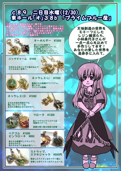 c89おしながきUPしました!https://t.co/QM2EbO413Z 小林美代子さん、15年ぶりのコミケ参加だそうです♪アレンジCDはパソコン故障で断念しましたが、天地創造モチーフのレジン雑貨が沢山あります!待ってます♥