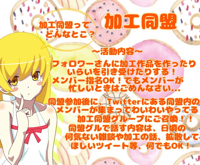 現在、約60人で活動しています!加工師、加工経験者の方なら誰でも入団OKです!ぜひ加工同盟に入りませんか? 興味がある方や入団したい方は僕(@majutushikoyomi)をフォロー&DMください!また、同盟の詳細は画像に載せてありますのでそちらもぜひ!それではお待ちしています!