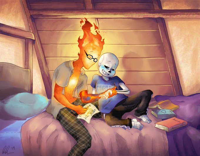 Sans is over at Grillby's to study some monster-soul stuff, but Grillby is more interested in the human anatomy diagram Sans found at the dump. And more specifically drawing comparisons (∗ᵕ̴᷄◡ᵕ̴᷅∗)՞
