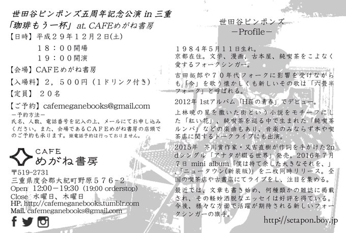 12/2 世田谷ピンポンズ五周年記念公演in三重『珈琲もう一杯』の開催が迫って来ました!