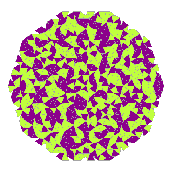 ¡Ya logré hacer teselaciones de Penrose bien! Ahora, a jugar con los colores, que en este ejemplo están puestos al azar. Dentro de poco publicaré el experimento y el código en https://t.co/CMSW65GE4l y en https://t.co/sfN0nYqWnx #rstats #matematicas #generative