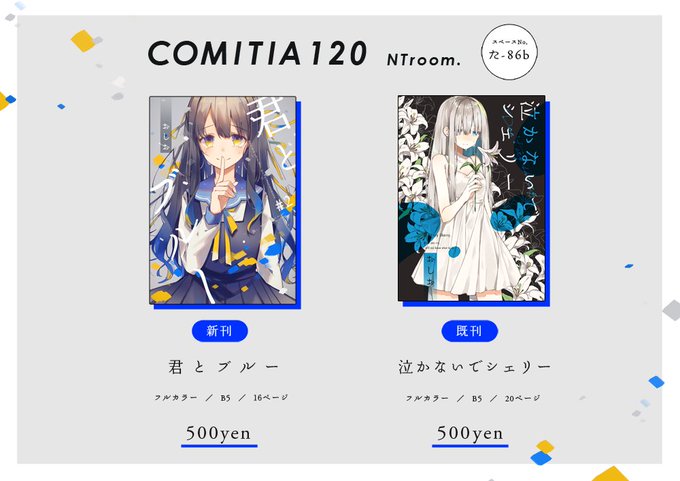 5/6 COMITIA120 お品書きです。新刊「君とブルー」既刊「泣かないでシェリー」を持っていきます。単行本や同人誌へのサイン等はいつも通り午後にお願いします! 【た-86b】NTroom.にてお待ちしております〜どうぞよろしくお願い致します。