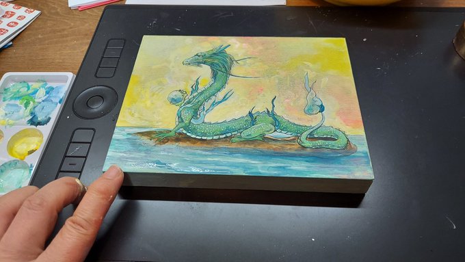 落款屋さんが二種類彫って下さったお礼に小さな板絵を制作したが(アナログは最近専ら板絵)、板だと落款綺麗に捺せない事が判明。最初のが気に入らず1から描き直したのに。紙に新しいの描いて落款捺した作品作り直すか。