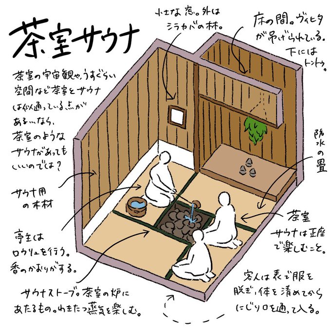 こんなサウナがあったらいいな。茶室サウナを描きました。大学時代に聞いた「茶室は極小空間だからこそ、そこに宇宙を創造した」という話からサウナと茶室は似てるのではとずっと思ってました。薄暗い室内、炉を囲む構造、心の宇宙を描く…茶室だからこそ更に己に没頭し宇宙に飛んでくサウナです🧖♀️🧖♂️