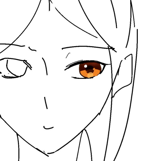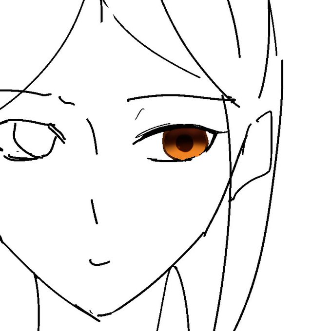 ハイライトはこんな感じで白と目の色なじんだのもちょっと足してみたりとか。あと瞳孔の縁にも輪郭線あったほうが良いのかもしれない。丸い瞳孔の線描いて内側に色付けた後、クリッピング機能で瞳孔の線の上に輪郭の濃い色付けるみたいな。いっつもはペンでぐりぐり丸く塗ってるだけだけど