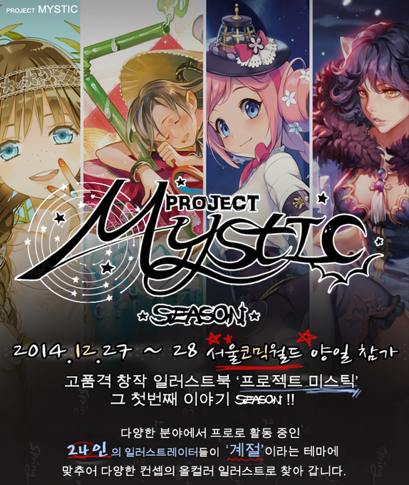 안녕하세요!! 12월 코믹 창작 일러스트 앤솔로지 'Project.Mystic'입니다. 참여작가 리스트를 우선 공개하오니 지속적인 기대와 많은 관심 부탁드립니다! .->http://t.co/RpTkj9c9iX