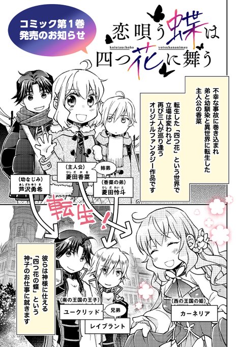 明日(5/1)発売のFLOSコミック『恋唄う蝶は四つ花に舞う』コミックス第1巻の告知&紹介漫画です!オリジナルなので、先が読めない物語をお楽しみいただく異世界転生ファンタジーです✨よろしくどうぞ!