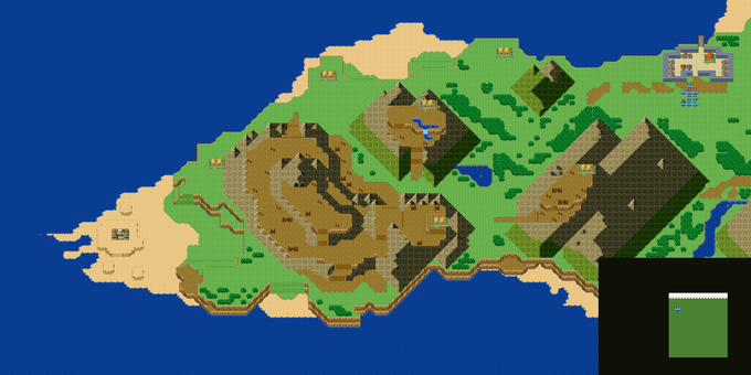 図1の右上か、図2の右下の専用空間にいるキャラが行う仕組みなんだけど、専用空間の位置は図1の様に画面上部に表示(全体像が正確に見える)か、図2の全体図の一部をくり抜く形で表示(スクロールがやや楽)のどっちが良いと思う?