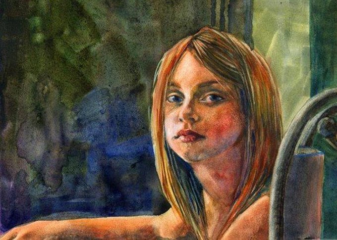 ACEO ATC Young Girl Direct Gaze Independence Day Watercolor Print DelPesco by bdelpesco