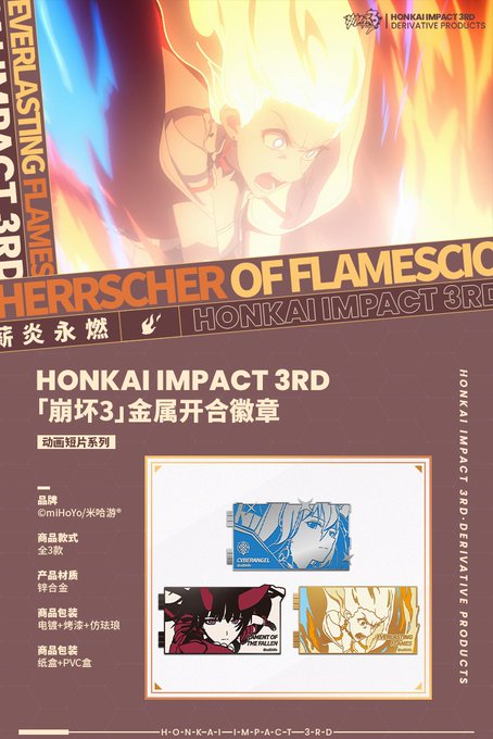 Herrschers: Flamescion (Kiana), Thunder (Mei), Reason (Bronya) Metal pins - 69CNY