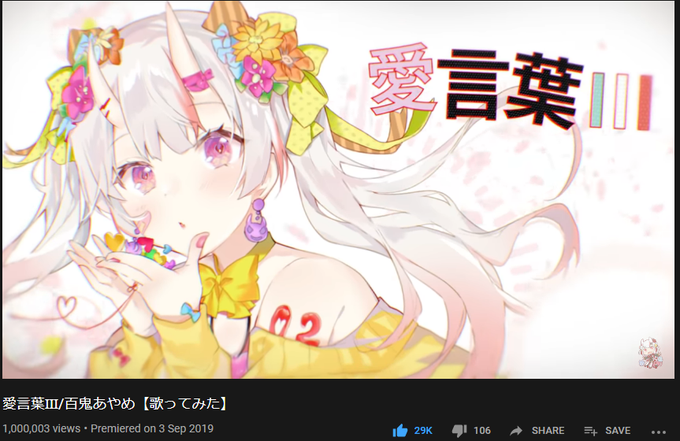 あやめ嬢!!「愛言葉Ⅲ」の1,000,000再生おめでとう!!🎉🎉🎉