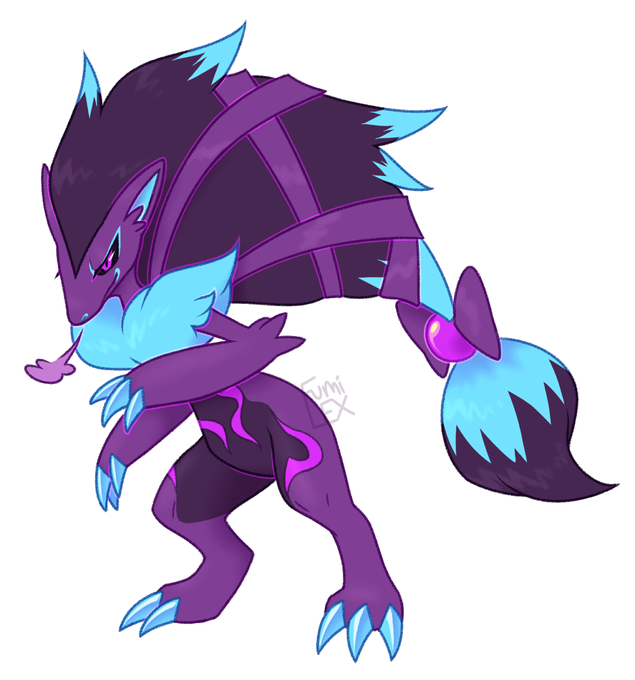 Another Poke'hybrid OC design! This one is mainly zoroark with salazzle and other requested features, including custom colors (very specific colors and placements were chosen by the commissioner, so I consider them a co-designer on this)!