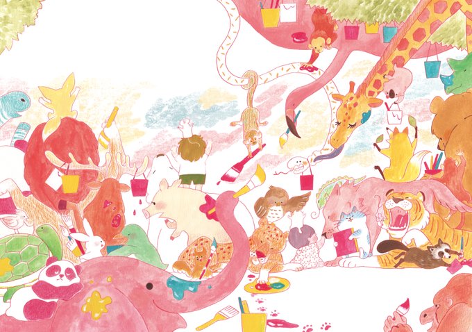 #ひるねこBOOKSレーベル 『ゴロウのえほん』好評発売中。こーくんが「おえかきしたい」とページを開くと、たくさんの動物たちが。みんな楽しそうですね🖌幸せな気持ちになる場面です。