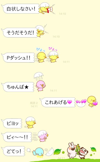 ★新作LINEスタンプ★ 「ふきだしタマゴとヒヨコ」発売!トーク画面がヒヨコだらけになります。使うとこんな感じです。既読虫とのコンボもできちゃいます(笑)