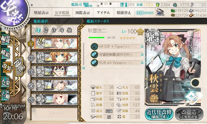 外出時間が長くなって夜になりましたが今日の目標だった秋雲センセーと無事ケッカリできました(大して経験値残ってなかったけど…)。