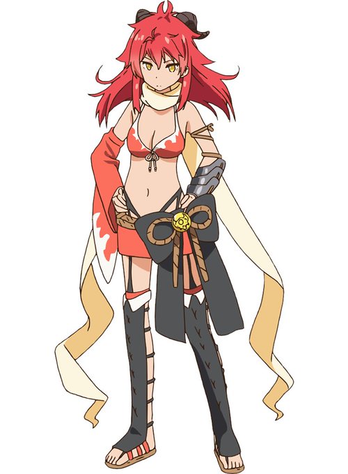 ブーフヒュレによって変身したカザンは髪が赤に染まり、二本のねじれた角、胸と腰だけを覆うビキニと腕と足に鎧を纏う姿に変身します。