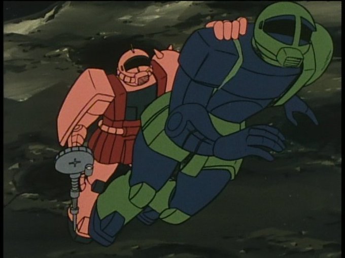 ガデムのザク、本編では旧型であるという言及は一切ないんだよね。劇場版予告にも登場しているけど、そこでは「ザク」としかクレジットされていない。そも設定画稿における表記は「ガデムのザク」。だからといって「ガデム専用ザク」って言い出すのはなんぼなんでもアレだと思う(^^;)
