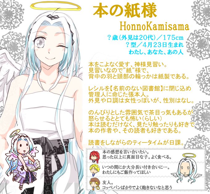 見習いだけど、何もない異空間にドーンと図書館建てたり人の記憶を喪失されたりと、現状でもだいぶ強い神パワーを持っています。 誕生日は「世界本の日」