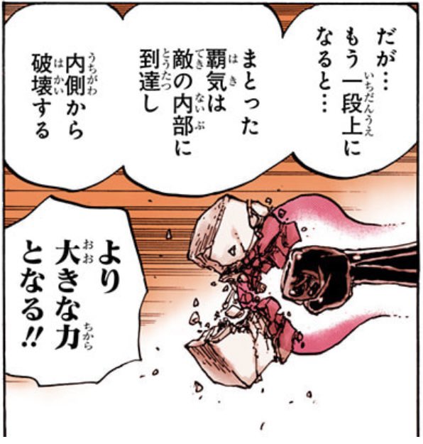 ちな衝突系はカタクリとのがすっごい好き、覇気全部でどんなの好きかって言われたら流桜が好きですが空島の時の心網とか足柄独行とか覇気のことわからんくて「え!?あの人たち何者!?」って感じのシンプルな覇気もとんでもな