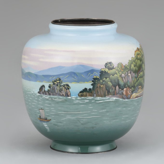 近景の舟、岩や木を有線七宝で、遠景の山々や空を無線七宝(※金属線による縁取りがない)で表現しています。