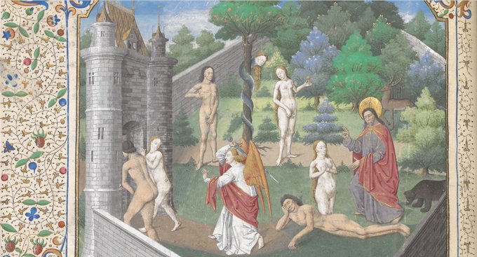 1500年頃は盛期ルネサンスだが同じ時期の写本の彩飾画の表現のほうが一歩先を行っているように感じることがある。ルネサンスの次はマニエリスムだが、その一つの特徴は異なる時制の出来事が一枚の絵に描かれること。手前で釘を打たれるキリストは遠景では磔刑に処され、アダムとイヴの物語も進行する。