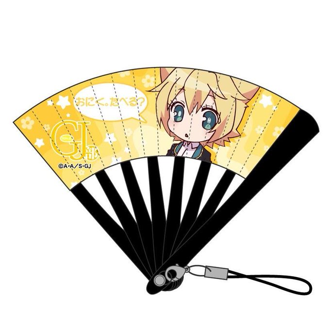 新商品紹介です!ミニ扇子ストラップ。「おにく、たべる?」でなく「おにく。たべる?」です。ここポイントです。こちら本日より予約開始です! (商品化担当) http://t.co/O0lrWyxkDX #GJ部 #gj_anime