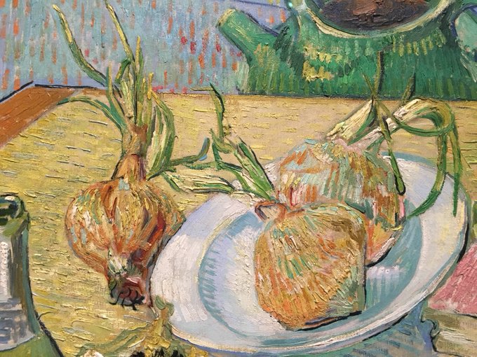 「ゴッホとゴーギャン展」愛知県美術館での開催も今月20日まで。写真や映像では伝えきれない筆のタッチや微妙な色合い、そして画家の想いなど是非会場でお楽しみください!と言いつつ写真でご紹介、ゴッホ《タマネギの皿のある静物》(部分)。#ゴーギャンが描いたタマネギも会場で探してみて下さい