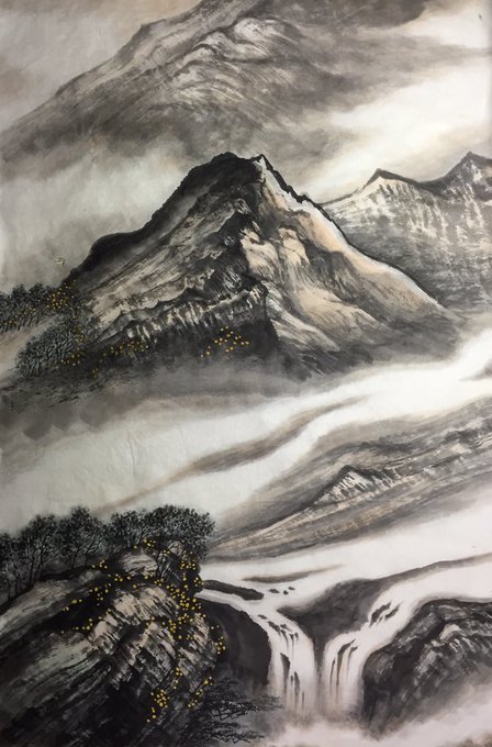 掛け軸サイズ。山の描写って超難しい。なんでこんなに描けないんだ。早く墨と筆の扱いに慣れたい。個展前なのに、展示と関係ない山水画描いてます。描き出すと止まらない。