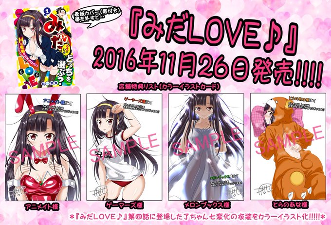 【告知】今月11月26日に『みだLOVE♪』単行本第1巻発売です!画像は帯あり状態の表紙なんですけど。実は帯面積が通常のより多く、帯を外して見ると…その詳細は是非実物でお確かめ下さい!書店特典は7種類、確実に欲しいと言う方は各書店さんにて予約などして頂けると良いかと思います!
