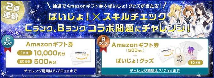 【二週連続・ぱいじょ!スキルチェックコラボ問題キャンペーン実施中】ぱいじょ×スキルチェックのコラボ問題に挑戦すると抽選でAmazonギフト券などのプレゼントが当たります(*'ω'*) https://t.co/xenuVPrZlq