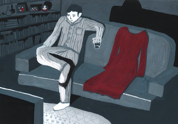 青山塾課題。テーマは〈部屋+人〉。三年前、同居していた恋人が出ていってしまったが未だに忘れることができない30代男という設定で描いたもの。眠れぬ夜に、テレビを見るともなしに眺めつつ、彼女の面影を傍らに置きウイスキーを飲んでいる、田山花袋『蒲団』のラストシーンみたいなイメージ。
