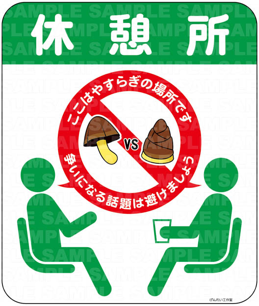 「休憩所・ここはやすらぎの場所です 争いになる話題は避けましょう(きのこvsたけのこ)」ステッカー