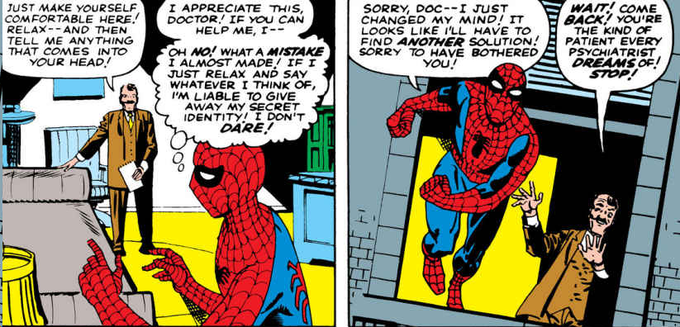 【ASM 13】スパイディ「感謝します、先生!じゃあ―(ハッ、ダメだ!リラックスして思いつくまま話したら正体言っちゃうかも。そんなの絶対ダメだ!)ごめん先生―気が変わった!別の解決策見つけないとね!邪魔してごめん!(脱兎)」(*表紙ネタバレ犯人は初登場のミステリオ)[画像:試し読み頁引用]