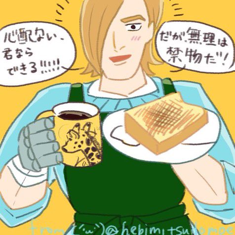 こまざわさん(@hebimitsudomoe)が私のために、朝ごパン用意してくれるドマを描いて下さったので自慢させてください…!!!!!