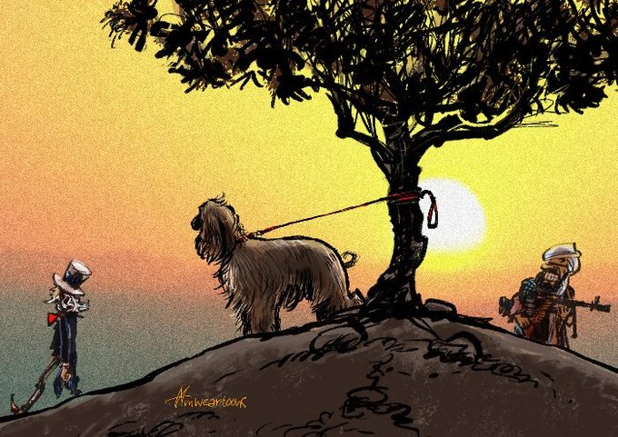 Misma metáfora sobre la salida del ejército #Usa de #Afganistán en versión de Maarten Wolterink @mwcartoons para sociedades sensibilizadas con el abandono de mascotas y de @EmadHajjaj para las dadas a ovinos rituales