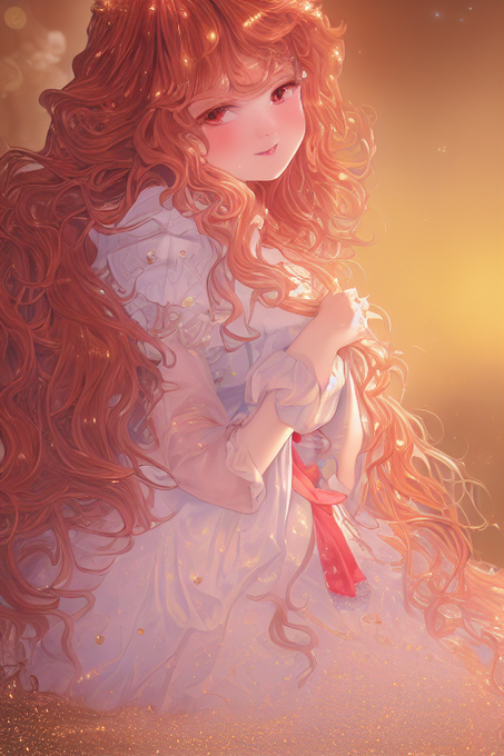 kawaii maid girl with long wavy hair like glitter flame