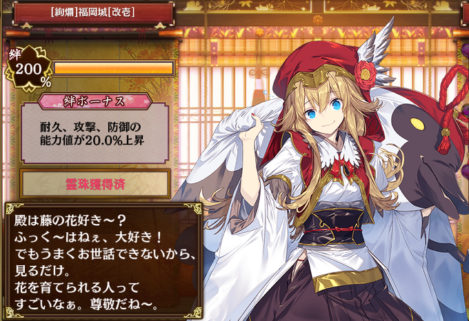 コ!スタートダッシュ招城でお迎え出来る【絢爛】福岡城ちゃんなの!贈り物で藤の花が大好きと言っているの!これは彼女と縁の深い黒田官兵衛君は幽閉されてた時に牢から見える藤の花を見て勇気付けられ頑張って生きると誓ったの!上手くお世話出来ないので見るだけと言っているのが深いなの #城プロ