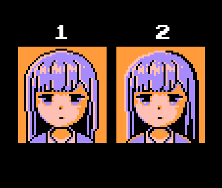 阿波連さんのドット今までなら①で完成にしてたと思うけど、黒い縁の左側を消して右側の縁を太くしたらいい具合に立体感が増した。あと目のハイライト的な1ドットとかをちょこちょこ。