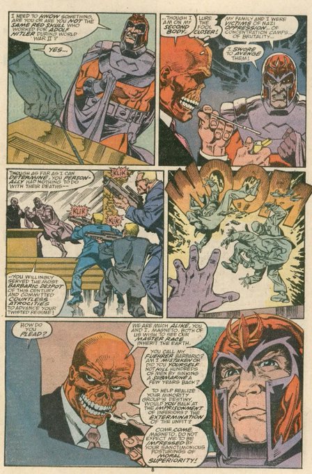 I'm not sure who's stupider here: @StephenByrne86 for the sheer ignorance/cartoon strawmanning that went into the original image or @AdamLanceGarcia's ridiculous hot take. Magneto's a Holocaust survivor and the Red Skull's a literal Nazi. And both he and the Joker hate Nazis.