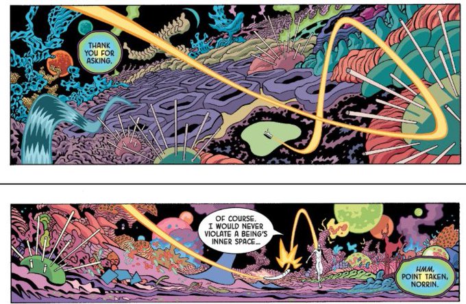Espero que Tradd Moore yDave Stewart dibujen y coloreen pronto una serie de Doctor Strange viajando por los planos mágicos y otra de Antman yLa Avispa explorando el microverso, porque el dibujo yel color de esta serie son una maravilla. Seguro que a @cubismofriki le interesa