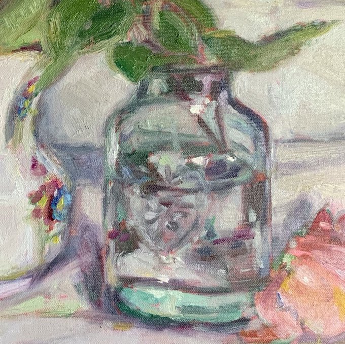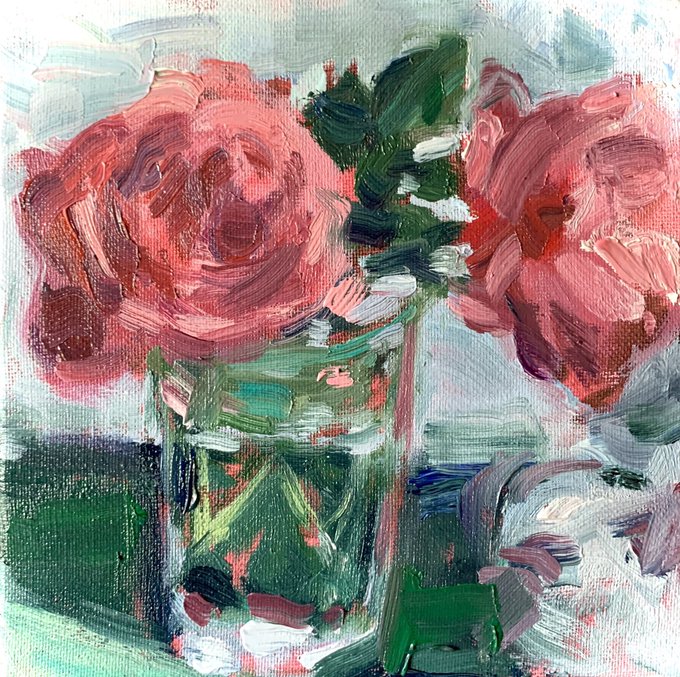 Small oil study. Roses from the garden, where I tried to capture them before they went. Oil on canvas 20 x 20 cms.