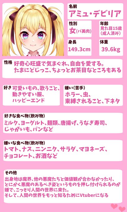 はじめまして、バ美肉Vtuberになる予定の可愛いもの大好きな悪魔、アミュ・デビリアだよ!今は準備中だけど、秋頃にはデビューできるはず!君に素敵な夢を見せちゃうかも💕