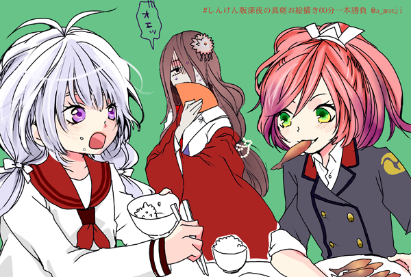 本日の極鍛刀で出てきてくれた3人で「いっぱい食べる君が好き」 (数珠丸はあんまり食べなさそうなので「扇子」) #しんけん版深夜の真剣お絵描き60分一本勝負