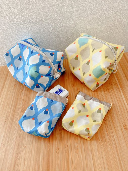 文鳥モロッカン柄のテキスタイルを使用し、文鳥チャームとスウェードで全体を引き締めたシュシュ、コロンとした大きめのポーチとばねポーチは、実は@kikucccchi さんの作品です🍀