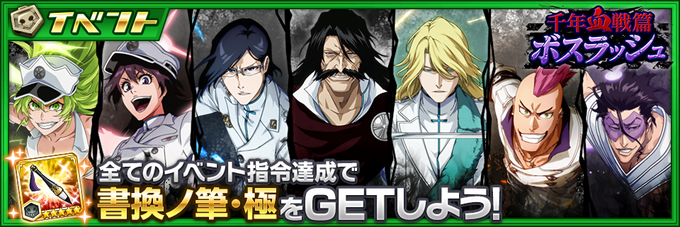 『千年血戦篇 ボスラッシュ』開催!千年血戦篇のキャラクターたちがボスとして登場!全てのイベント指令をクリアすることで書換ノ筆・極と合計4個の書換ノ筆が入手可能になっているぞ! https://t.co/MVC0Q9hs1c #ブレソル #ブレソル5周年