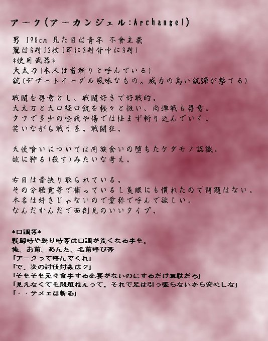 他には中性的、ジト目、青年、男装女子、女装男子、ぱっつん、モノクロ、原色、オッドアイ、隻眼とか色々好きです。ほのぼのより戦闘系が好き