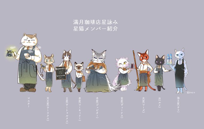 猫の日とのことで、満月珈琲店のマスターと一緒に働く星猫の面々のご紹介です😌