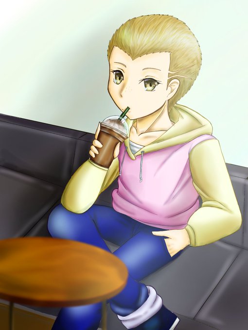 某珈琲店で誰かを待っている九頭龍くん。