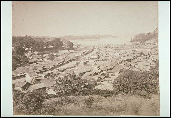 ④奥州塩釜ヨリ松島ノ遠景…ゑびや旅館の位置からおそらく愛宕神社からの写真。塩釜駅がないことから明治15年以前とのこと(国際日本文化研究所センター古写真データベース)