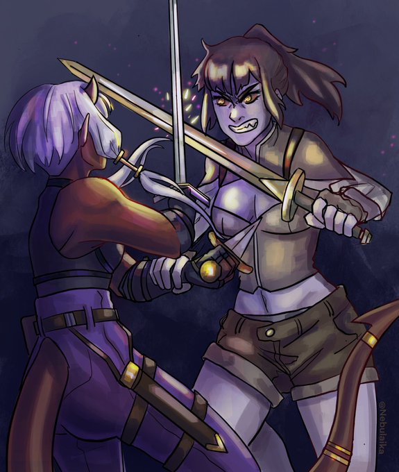 Artfight Revenge piece featuring my tiefling Devi and @Kwerp_Draws OC Edwen! #teamsteampunk
